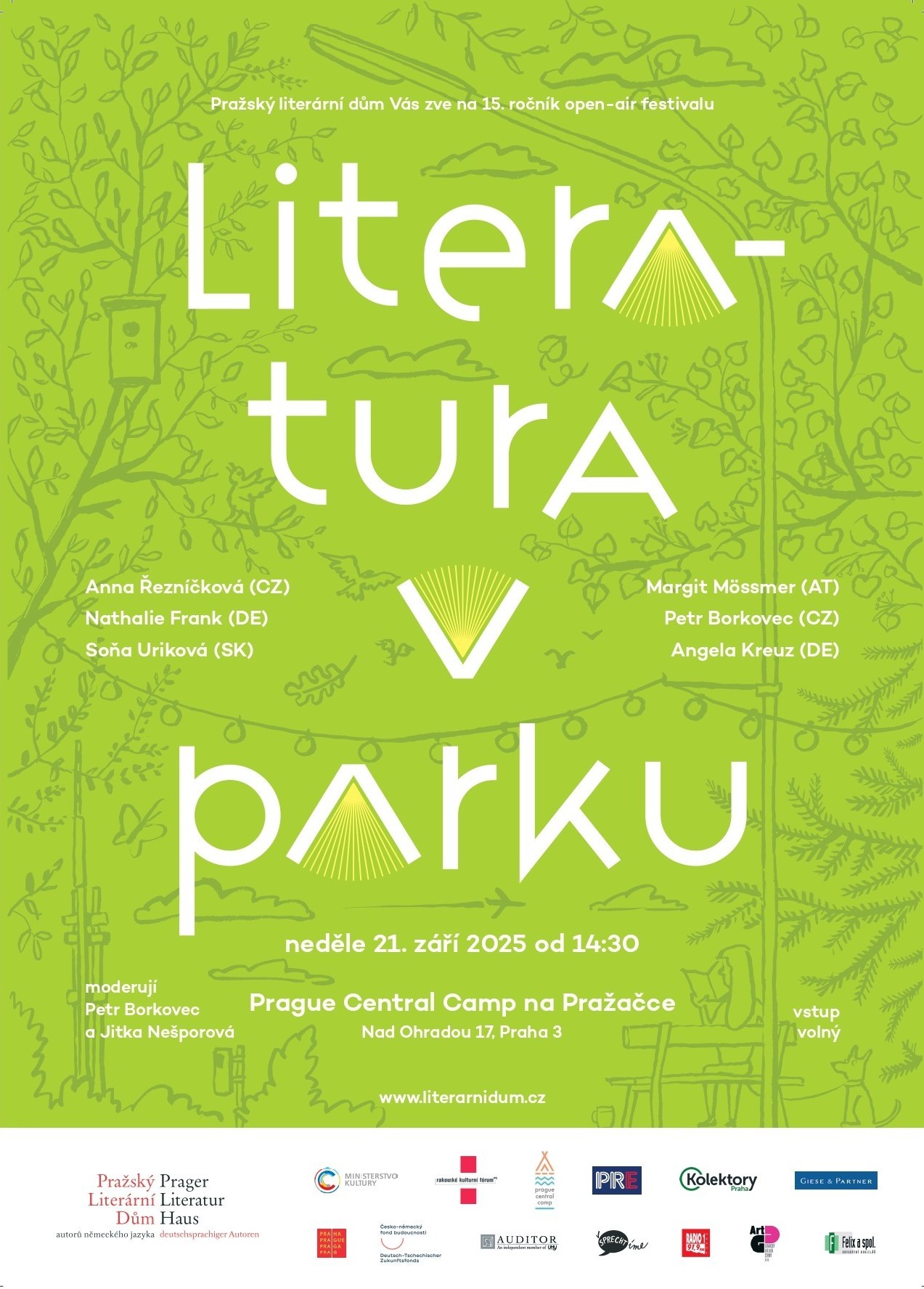 Prague Central Camp, Nad Ohradou 17, Praha 3, zastávka Vozovna ŽižkovSrdečně Vás zveme na 15. ročník open-air festivalu Literatura v parku, na kterém vystoupí se svými texty autorky a autoři z Česka, Slovenska, Německa a Rakouska. Mimo zajímavé rozhovory uslyšíte poezii, prózu nebo komiksové repliky, tak si to nenechte ujít!